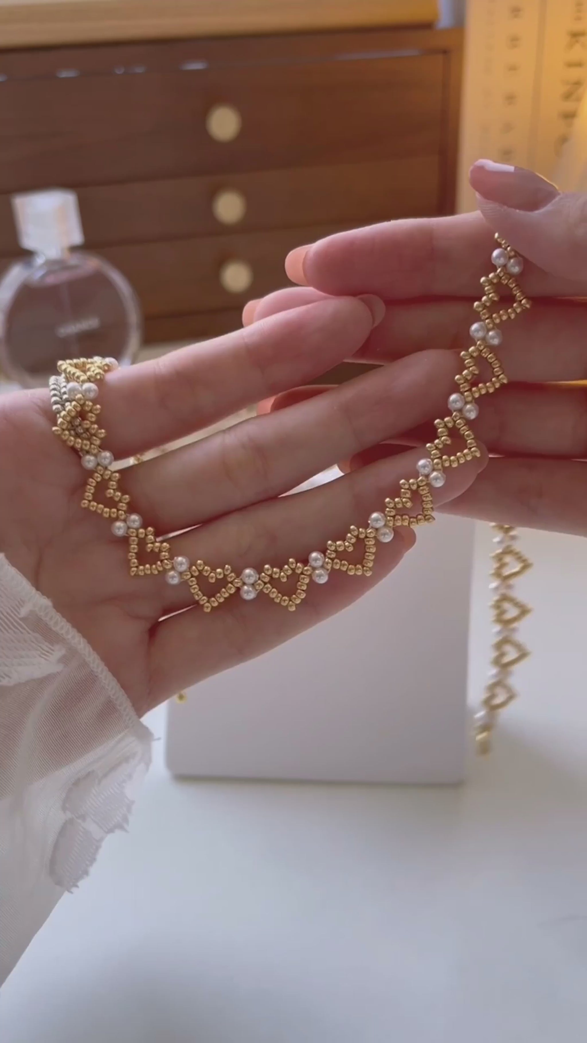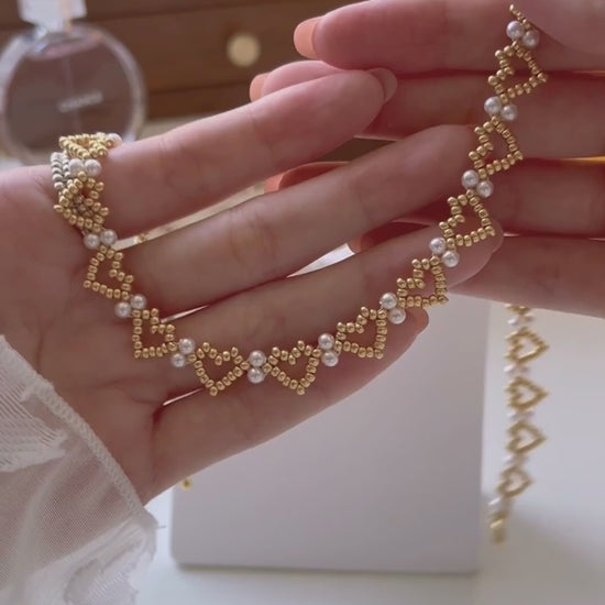 Presentamos nuestro collar de perlas hecho a mano con cuentas en forma de corazón: