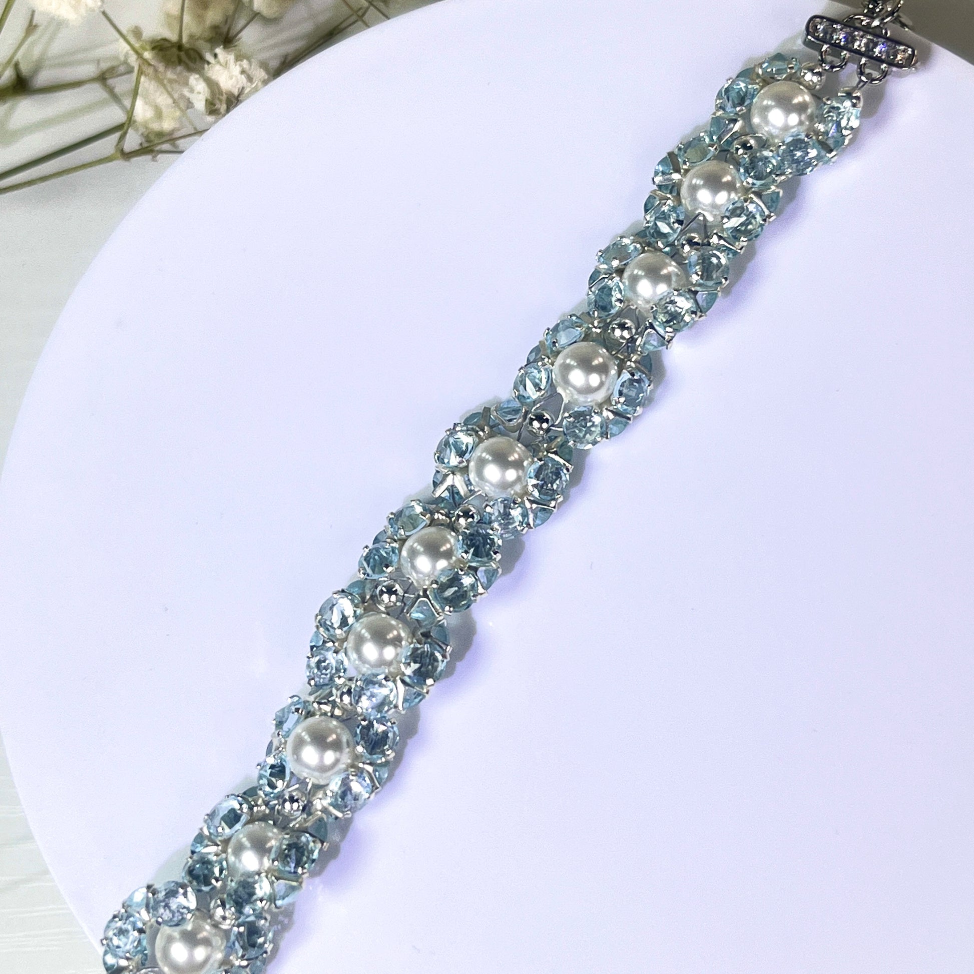 • Piedras preciosas aguamarina : el azul relajante de la aguamarina añade un toque de tranquilidad, complementando perfectamente las perlas.
