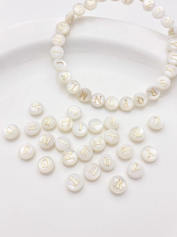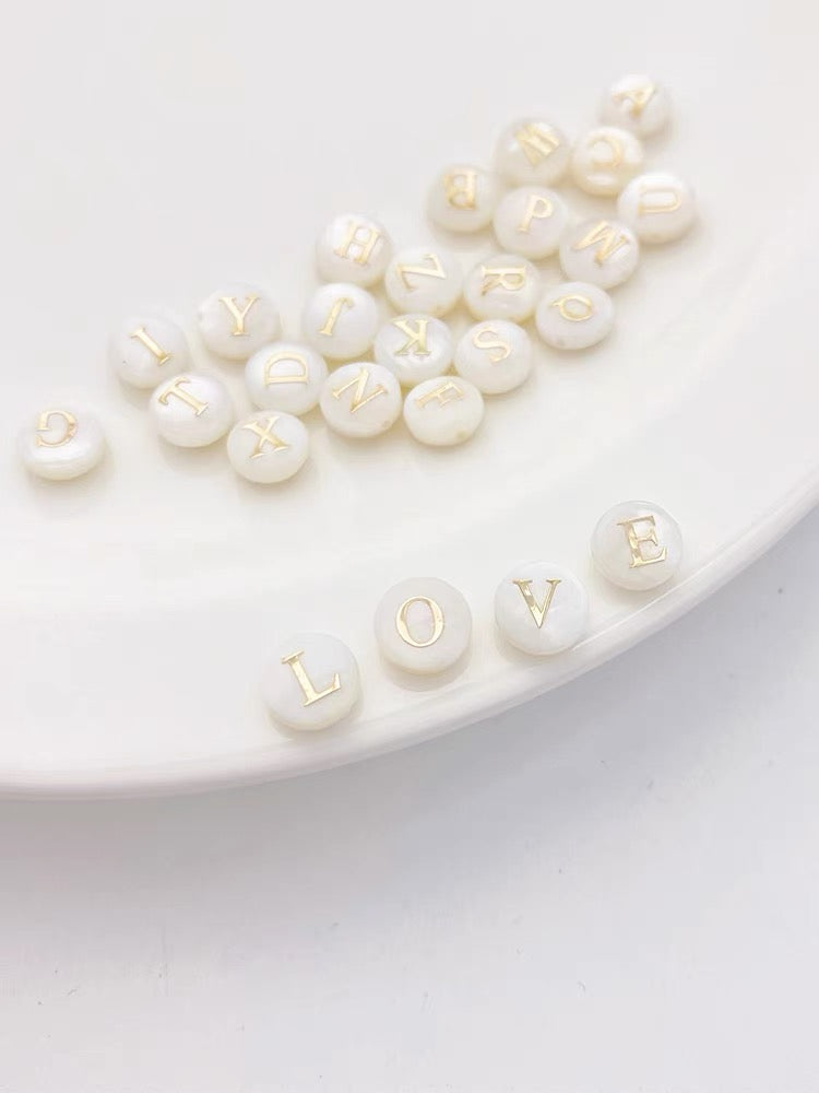 Realce sus proyectos de joyería y manualidades con nuestras cuentas de letras del alfabeto de lámina dorada de doble cara hechas de concha de agua dulce natural. Estas cuentas, que combinan la elegancia natural de la concha de agua dulce con el toque lujoso de la lámina dorada, son perfectas para agregar un toque personalizado y sofisticado a sus diseños.